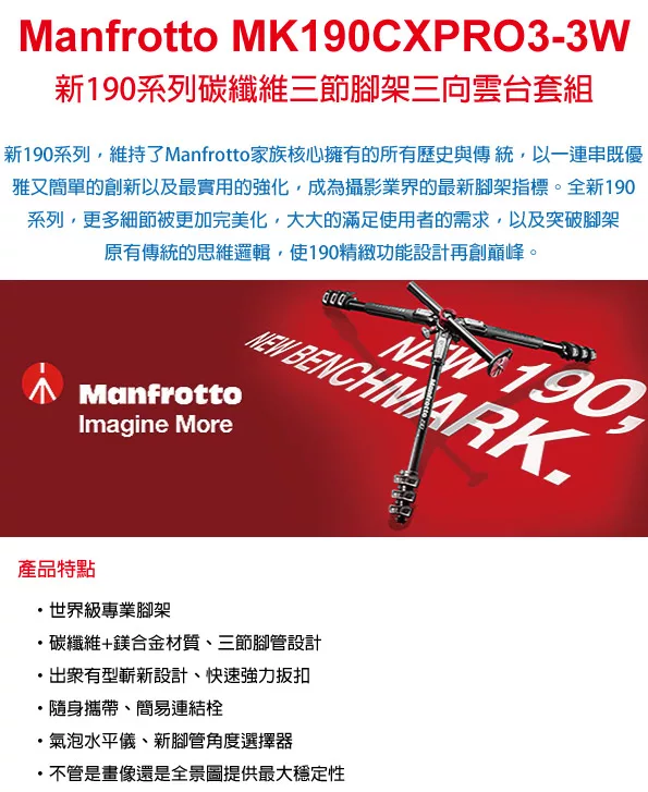 Manfrotto MK190CXPRO3-3W(MT190CXPRO3+MHXPRO-3W)新190系列碳纖維三節腳架三向雲台套組![]()