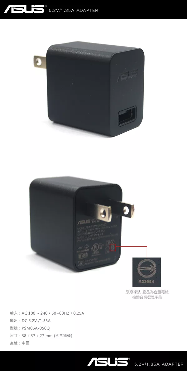 ASUS 原廠USB充電旅充插頭5.2V-1.35A(密封袋裝-電檢版)單色![]()